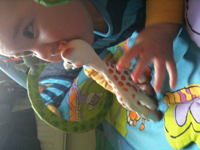 Alex is currently perfecting his raspberry blowing (which he often does when eating, spraying me with swedes and courgettes – nice!). And his rolling over is getting much more proficient, with occasional success at rolling back at last. He’s starting to make crawling attempts when he’s on his tummy. I suspect he’s a long way off mastering that, but it’s fun to watch him begin to learn how.
