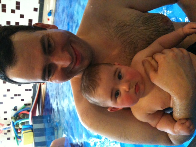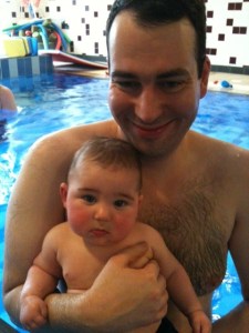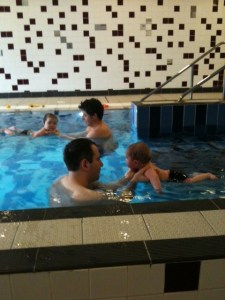 It was a fabulous 30 minute class, designed at getting all the babies used to being in the water. They were pulled around the water on their front, back and side – and did lots of singing “round the mulberry bush” etc. They were even totally submerged. Alex was his usual serious self, but didn’t cry and wasn’t at all bothered at being under the water which was fabulous. Hopefully he’ll enjoy swimming as much as his daddy – although not sure he’ll be ready for 2012!