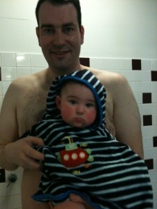 But the highlight of the week, and certainly something we’ve been looking forward to for ages, was Alex’s very first swimming lesson! We’ve signed up to Saturday morning classes for him so that it’s something he can do with Matt – and so at 9.30am today, Alex was sporting a rather dashing (and quite retro) baby swim nappy: