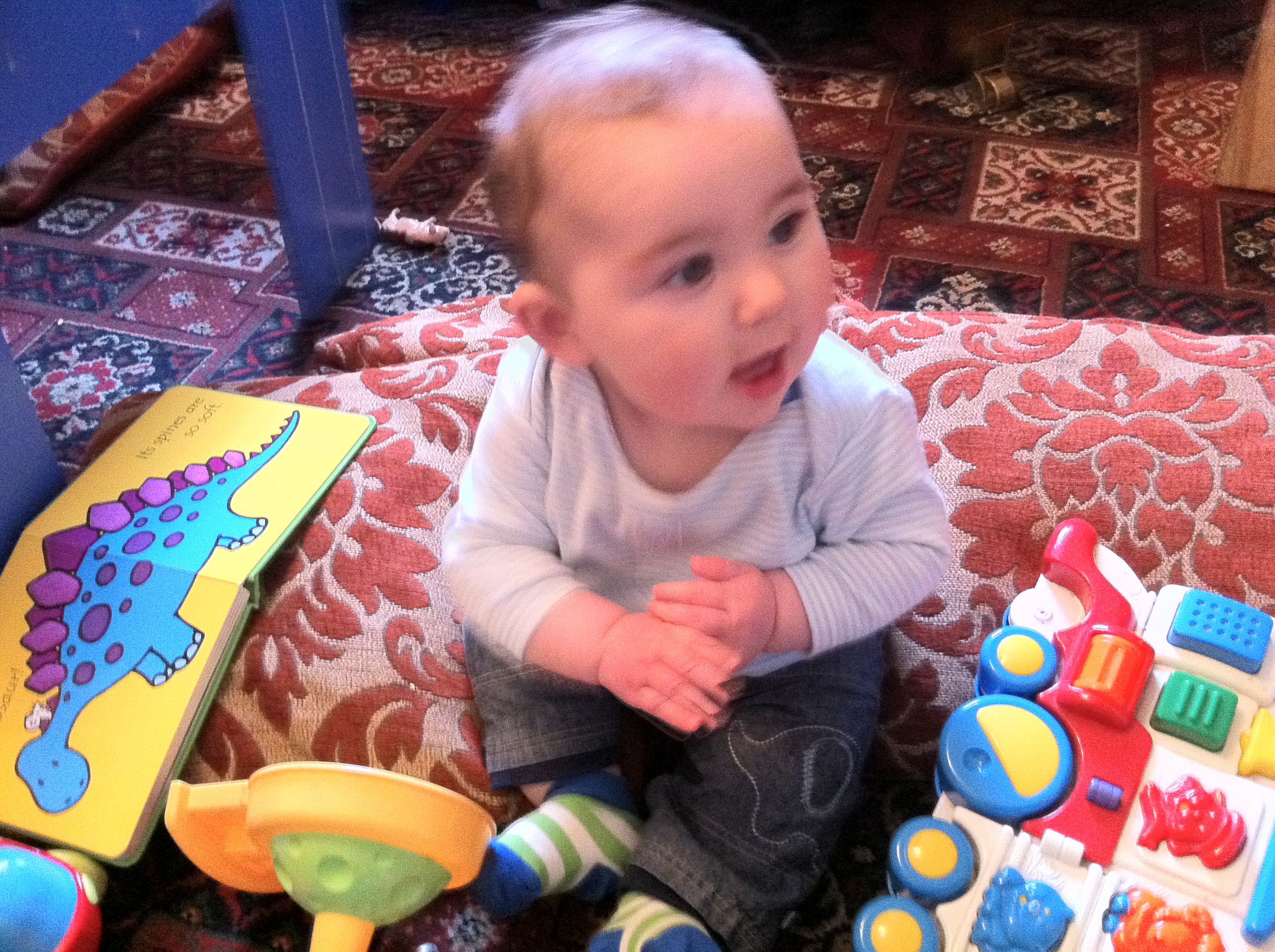 And here he is exploring a “baby sensory” zone at the playgroup he went to this morning: