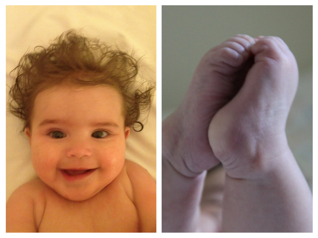 - How fascinated she is in her feet – often holding them both and chomping on her toes. When she’s having a really good feed, she really curls her toes.