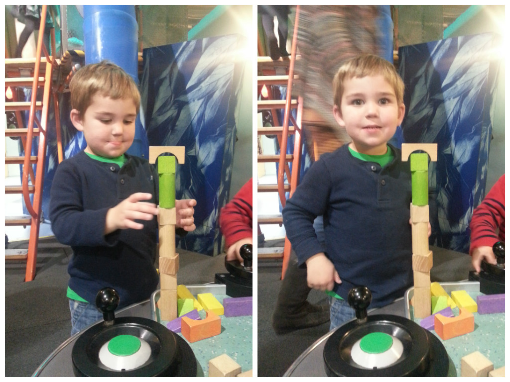 Alex had fun building towers on the earthquake trays and then shaking them down: