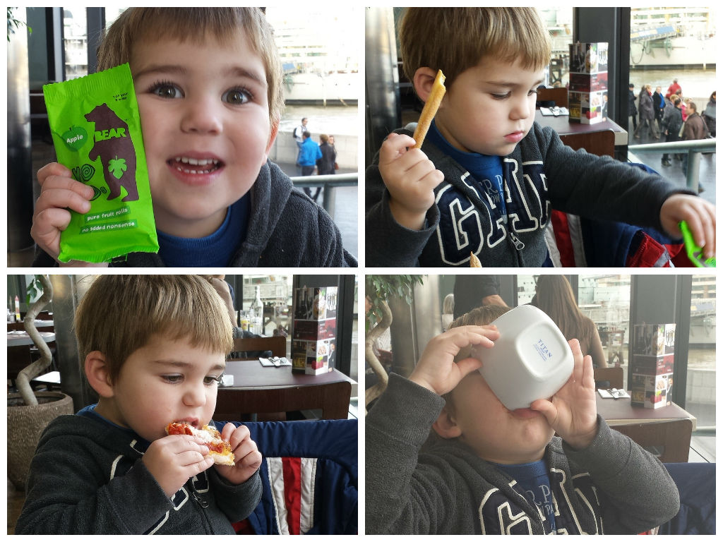 Once we’d said thank you to the performer, Alex and I wandered along the Southbank, checking out the boats along the way, before stopping at Strada for a lunch date! I think Alex is going through a growth spurt as he ate masses of breadsticks, pizza and licked his ice cream bowl dry (classy). And he was very excited about the packet of apple sweets given to him by Santa at the theatre (so much so that he insisted I took a photo of him and them!)