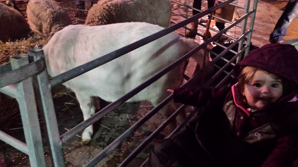 After a quick meander around Borough Market (and obligatory visit to Konditor and Cook for brownies and curly whirly cake) we headed home. Once Sophie was up from her nap, I took the children down to Herne Hill for the end of the local Christmas fair. The children were excited to find a selection of farm animals outside the station – Sophie in particular was thrilled: