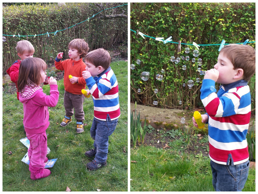 After a couple of hours at home for lunch and some quiet time, we were back out again, this time at Alex’s friend Rosita’s third birthday party. The weather was mild and springlike, so we all enjoyed spending time in their garden. The children loved the little treasure hunt laid on for them with treats like bubbles after every clue!