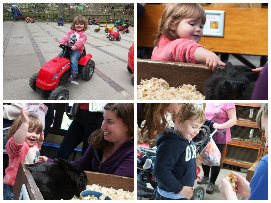 Saturday looked dry and sunny, so we took the children on an Easter trip to Godstone Farm in Surrey. A top favourite of Alex’s, and one of the nearest places for us to start feeling like we’re out in the country, we all enjoyed our day. There were lots of animals to pet, including some tiny chicks and rabbits (any bunny fans, I assure you, Sophie wasn’t about to hit the rabbit pictured below!):