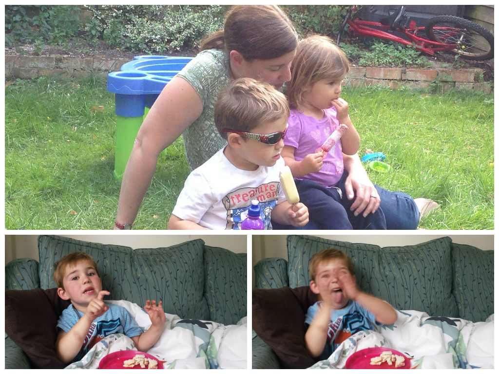 With both the kids on great form on Sunday, we thought all illness was passed – but sadly we had to collect Alex early from Jacqui’s on Tuesday. He had a temperature and was really sleepy and achy, so he slept all afternoon and all night. And then, to make things worse, Sophie was sick again at bedtime! So, Matt and I had to divvy up childcare duty on Wednesday while we had them at home getting better! Thankfully, a quiet morning under duvets saw them start to feel better, and by the afternoon they were eating ice cream in the garden.