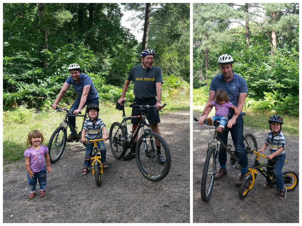 On Tuesday we headed to Berkshire to visit Matt’s dad. We met him at The Lookout – a really child friendly section of forest packed full of bike trails, walks, high ropes plus a great adventure playground and nature centre. We met Matt’s cycling-mad Dad there to see how Alex fared on the beginner mountain bike trail. I just love this picture of three generations of Agar cyclists! Sophie was very keen to join in, but she had to make do with a trip to the playground while the boys attempted the trail.
