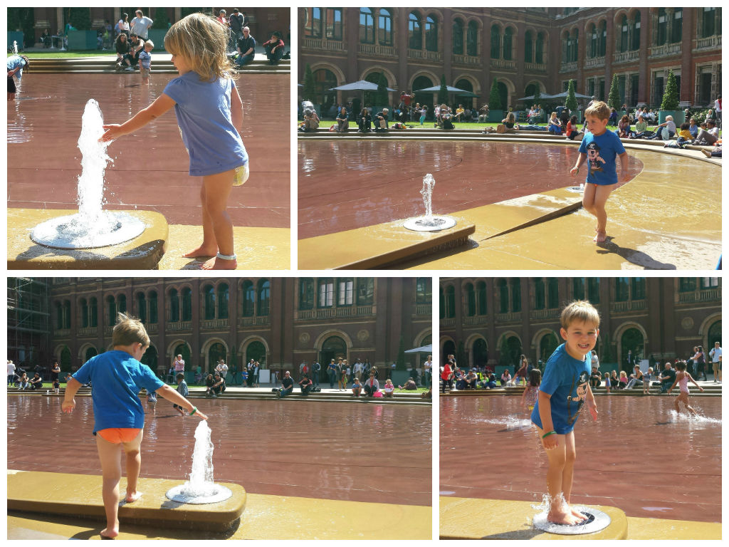 Once we couldn’t face any more crowds, we crossed the road to the Victoria and Albert Museum for a (horribly expensive) lunch and splash around their fountains and pool. Sophie was on fine form, smiling at everyone as she splashed her way around the circumference. It’s fun watching the smiles form on peoples faces as she walks past them with a cute grin.