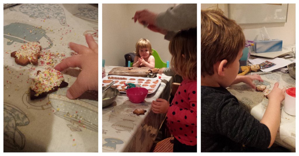 What else have we been up to? We’ve baked Christmas ginger biscuits with our friends Sam and Una – and made an enormous mess decorating them: