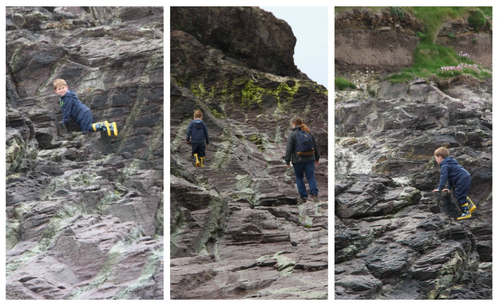 The children immediately set to clambering up the rocks which had a really striking purple and green striped pattern! Here’s Alex on his way up: