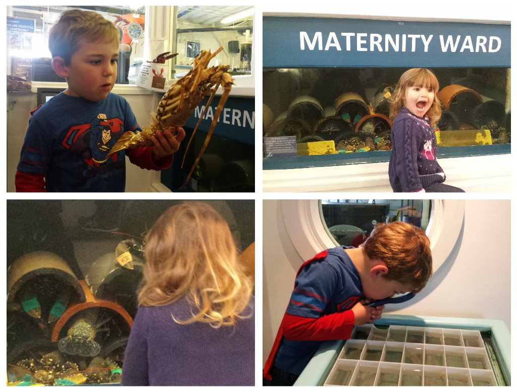 We popped into the National Lobster Hatchery (who knew?!) and spent ages exploring the place – it became a real highlight of the week for the kids. They just couldn’t get enough of looking at the lobsters, a couple of whom were behind magnifying glass to make them look enormous! They had great names like “Elsa” and “Jaffa”! We all enjoyed looking at the tiny babies and the mummy lobsters in the maternity ward. And Alex was brave enough to hold a full lobster shell!