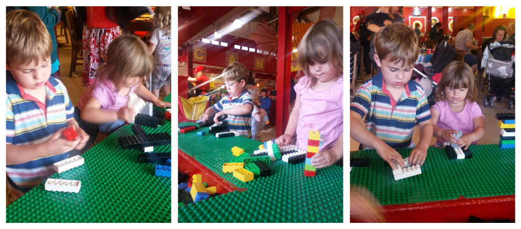 After finding most rides had 45-60 minute waits, we instead explored the free performances – loving the live pirate show. Sophie thought it was hilarious watching the pirates diving off the lighthouse tower into the lake. Following the show, we grabbed some lunch – the kids enjoyed the large duplo station in the corner of the restaurant!