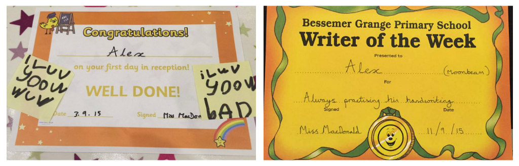 Here are his certificates – he got a cute one for his first day which he thoughtfully adorned with some handwritten notes saying “I love you mum” and “I love you dad” (or something close to that!).