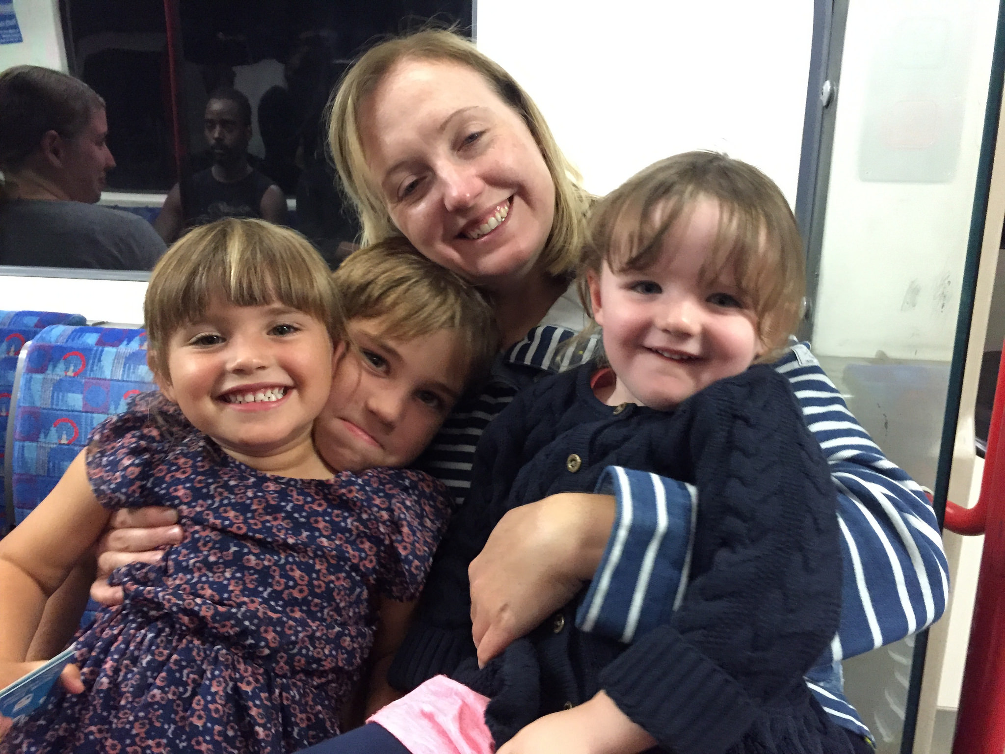 After some frustrating train delays, we were homeward bound (sorry about the photo Katharine, but the kids looked so cute together I had to post it!)