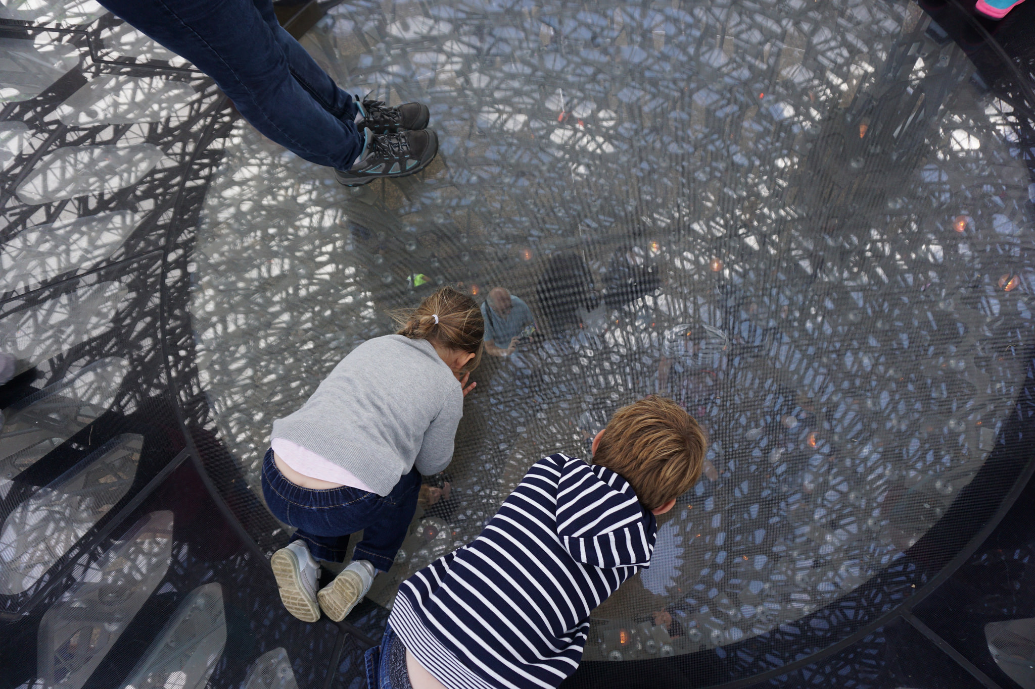Here’s the view from the base of the structure up to the skylight – with tiny feet on the frosted glass in the centre