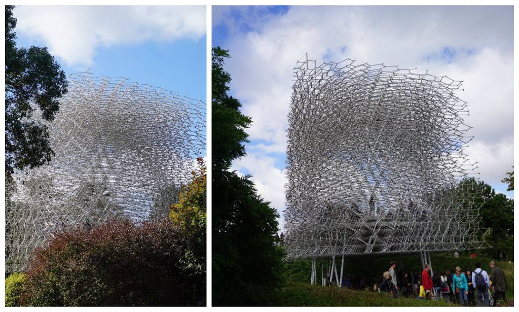 We finally made it along the flower bordered paths to reach the temporary exhibition that I was so longing to visit – The Hive. Originally created for the UK Pavilion at the 2015 Milan Expo, The Hive is a unique installation inspired by scientific research into the health of bees. It’s a huge, aluminium honeycomb structure which seems to change in shape as your walk around and in it – sometimes feeling quite solid, and others really ethereal and light.