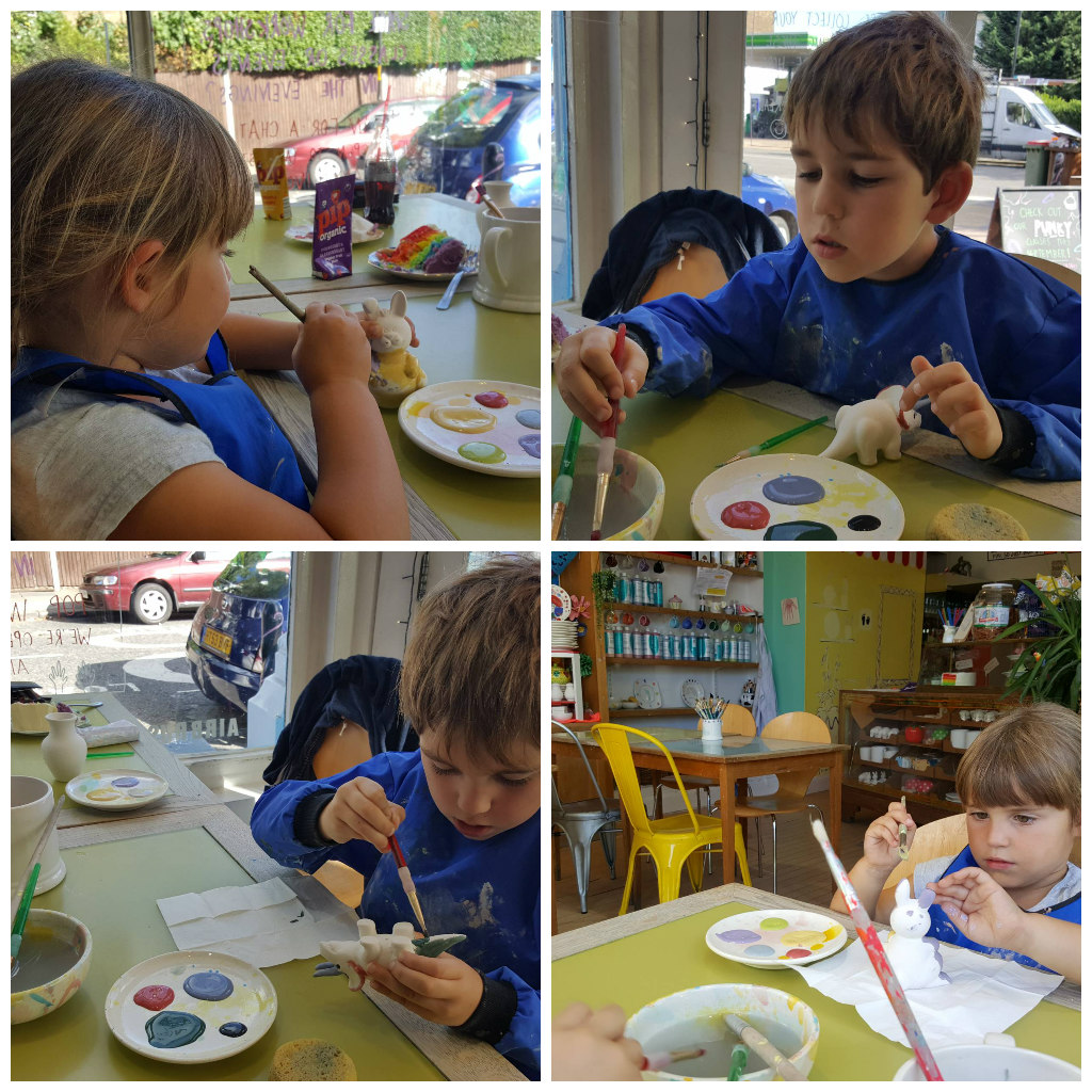 Matt spent a Sunday away on a training course, so I took the kids along to a local pottery painting cafe for some big slices of cake and some artistic fun! We all chose things to paint, and enjoyed a really lovely hour decorating our creations! Alex painted a dinosaur, Sophie a rabbit and me a little vase. They concentrated so beautifully – I was so surprised and proud!