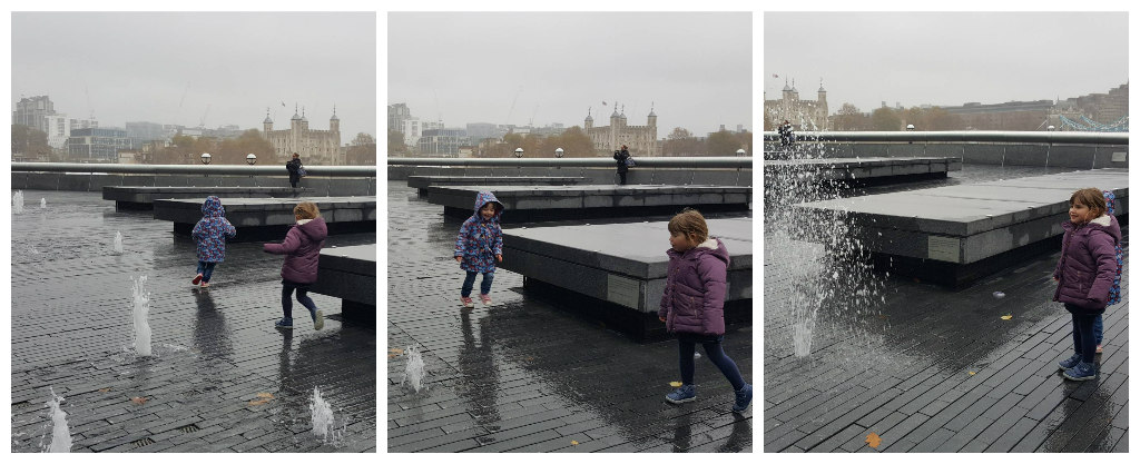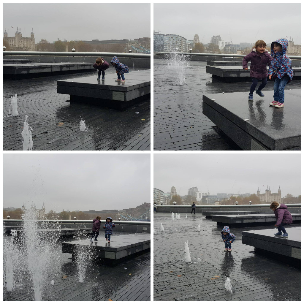 I think, though the girls loved the show, their favourite thing about the trip was playing outside in the fountains by City Hall. I couldn’t get great photos on the phone, but they were screaming with delight as they tempted each other to creep closer! So funny to watch!