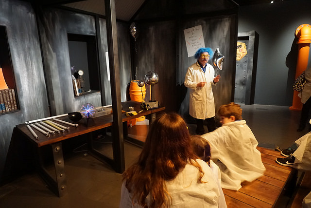 It was a pretty different day to our previous visit – bitterly cold and windy this time round – so we headed straight into No1 Smithery to check out ‘Doc Yard’s Secret Lab‘! An 45-minute long, hands-on science experience, the Secret Lab was based around the theme of electricity. While we were waiting for Doc Yard, and his assistant Bunsen, we all donned white lab coats and safety glasses and started experimenting straight away – conducting electricity to light up tubes!