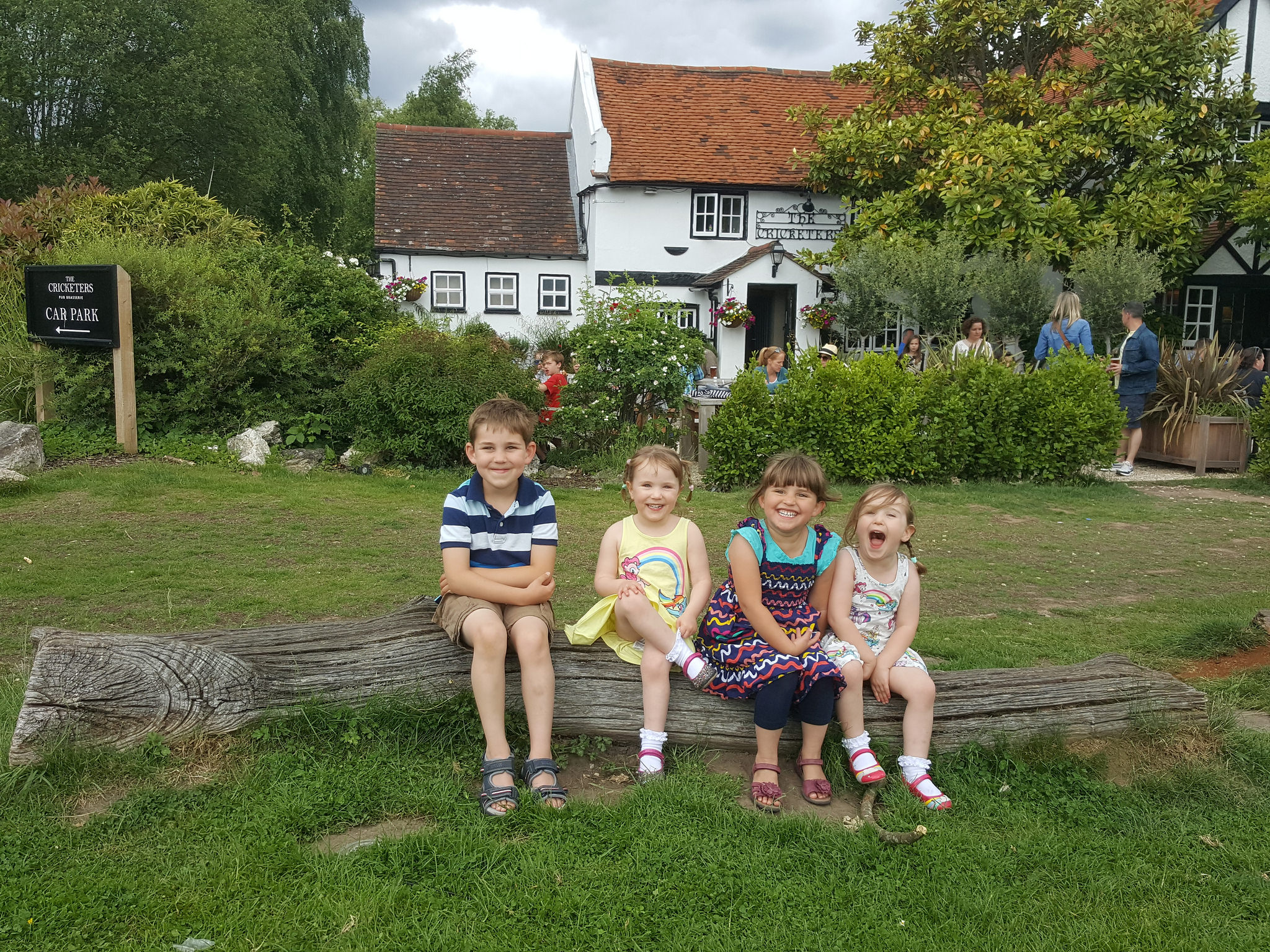 Alex and Sophie were thrilled to see their cousins, Lucy and Rose, again. Here they are together in front of the quintessentially English country pub!