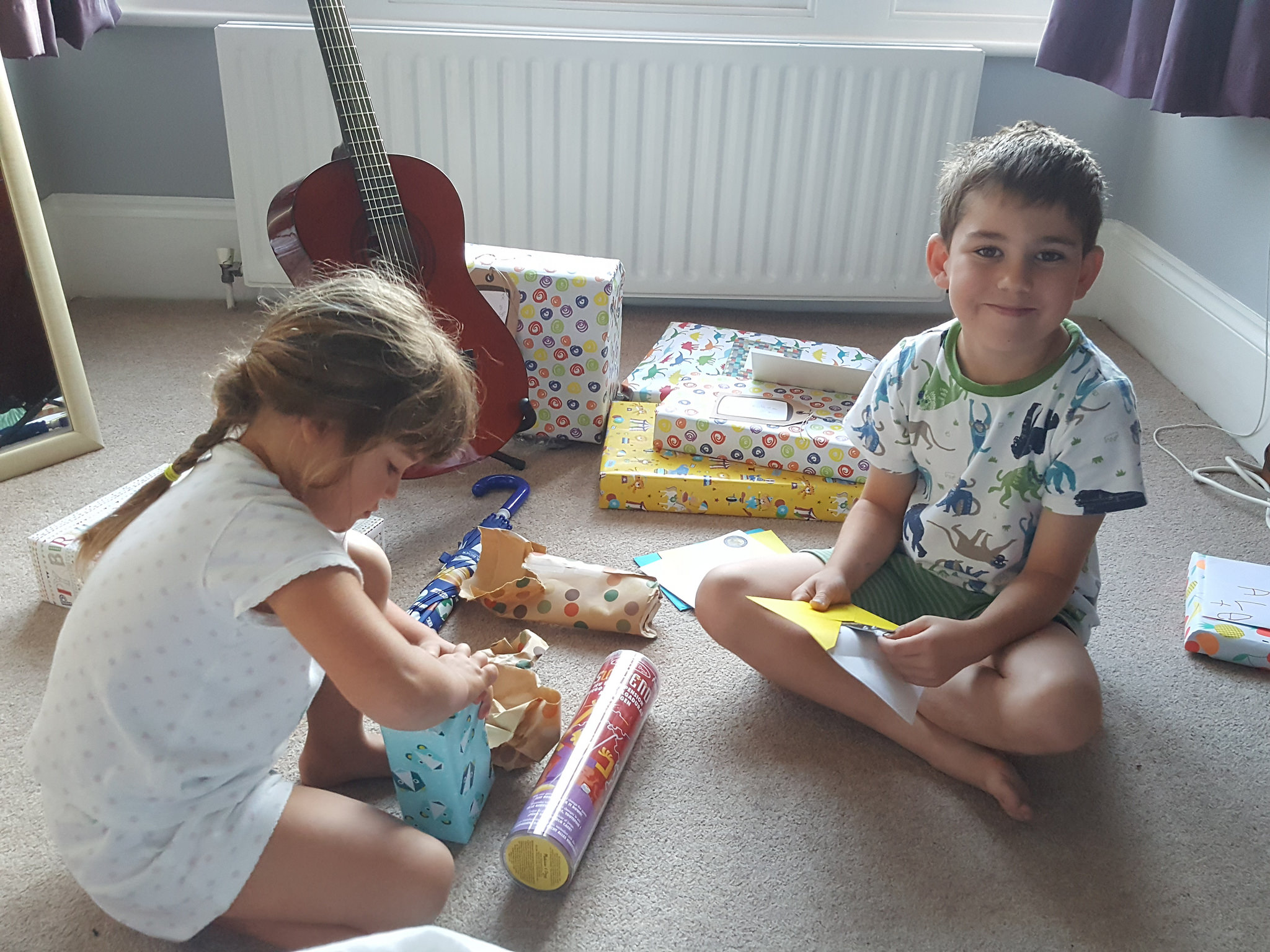 He celebrated his actual birthday on Tuesday. He was so excited running into our room first thing to open his presents, and was so very lucky. We now have enough lego to keep him occupied for days, magic tricks, lots of gorgeous new books, walkie-talkies and, best of all. a guitar and lessons!! Despite his excitement, he was generous enough to let his little sister share the unwrapping duties. I wonder if she’ll do the same in October!