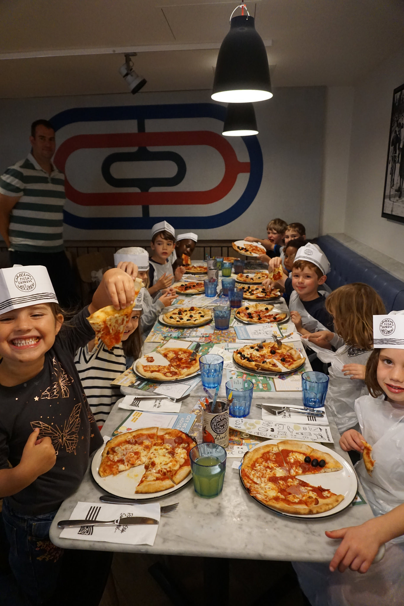 It was a really simple idea for a party, but the kids loved it! The Pizza Express team did a great job ensuring that there were enough dough balls to occupy the kids until their creations arrived – and making sure everyone got their own pizza back! And how they enjoyed eating them!