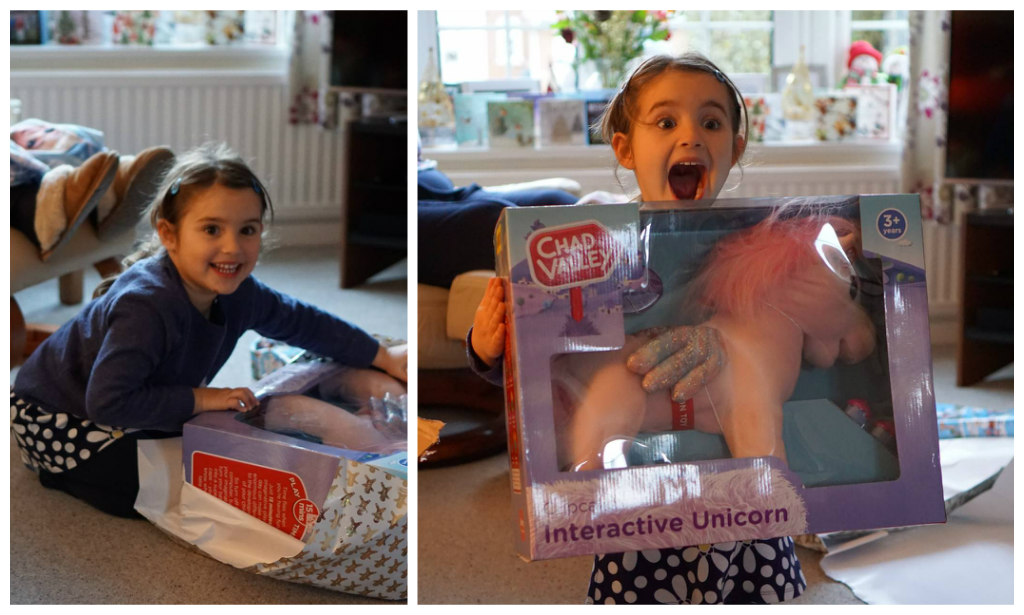 And Sophie – who had been asking for a “walking, talking, real-life unicorn” for months – adored the garishly pink interactive unicorn we found for her!