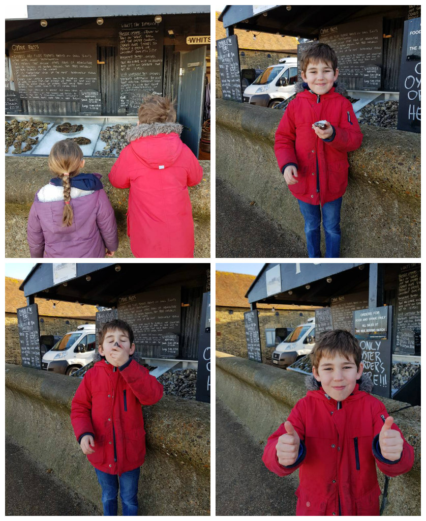 Sunday morning was clear and sunny again, so we went on an early wander along the waterfront in Whitstable. Alex had been fascinated by all the oyster stalls the day before, and begged me to let him have one! I, of course, obliged, expecting a comedic moment! But he gamely had a go and seemed to genuinely enjoy eating it!