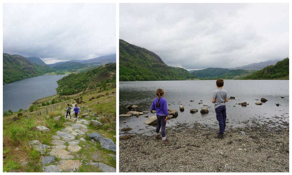 After enjoying the views and a sandwich, we headed down the other side of the hill towards the lake – Llyn Dinas – where, of course, the children threw about 1,000 pebbles into the water!