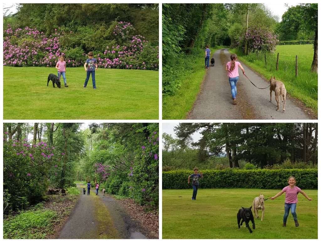 To close this post, and my write-up of our wonderful week in Wales, I must share a few snaps that probably represent the highlight of the whole holiday for our children. We spent a night with Matt’s cousins and aunt in their beautiful home in Nantgaredig. Our animal mad children adore visiting them as they have two lovely dogs, Sally and Hella (if our Welsh family are reading this, do correct my spelling!!). Within minutes of arriving, the children were seeking out the dogs and they spent most of our visit playing with them. Three months later, they are still talking about the duo! Here are Alex and Sophie taking them out for a walk around the gorgeous grounds: