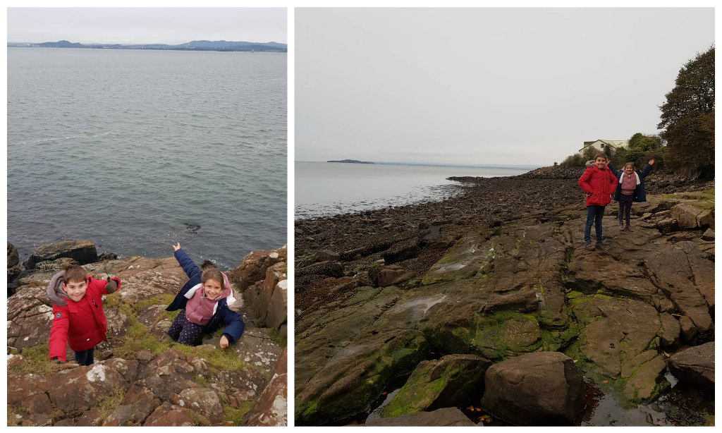 But we had to head back down South to our flat for the weekend – down on a different estuary – the Firth of Forth. We based ourselves for the short break in a little AirBnb apartment in the pretty seaside town of Aberdour. We enjoyed a chilly evening on the beach nearby and scrambling on the rocky shoreline enjoying views over the Forth to the city of Edinburgh (which the children are helpfully pointing out below!):