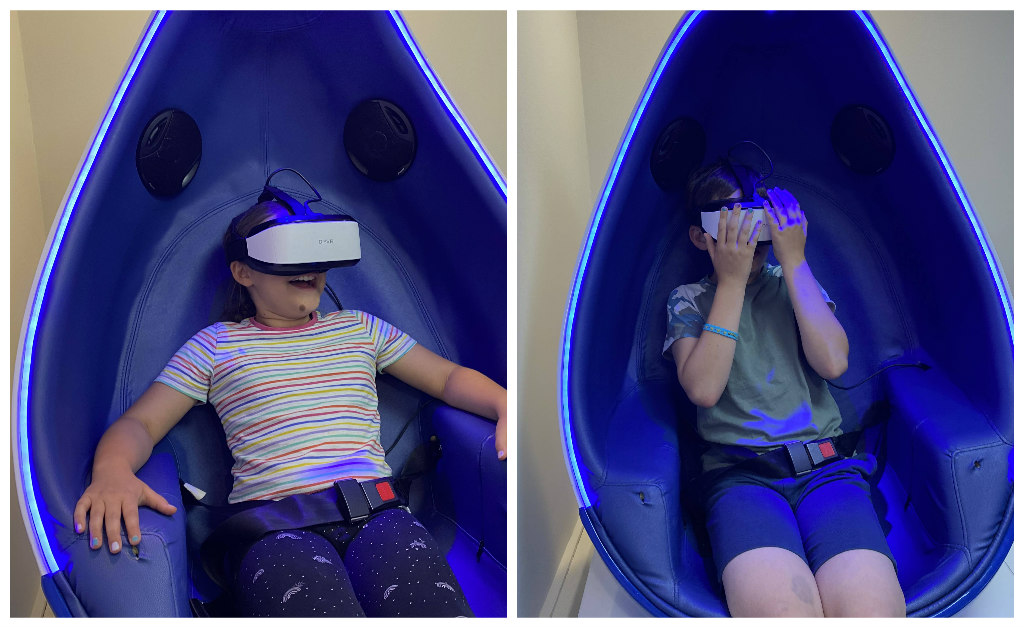 Inside the hydro hotel, we enjoyed afternoon tea and fun in the indoor playroom – including the kids first experience of VR experiences. Here they are experiencing a roller coaster and haunted house!