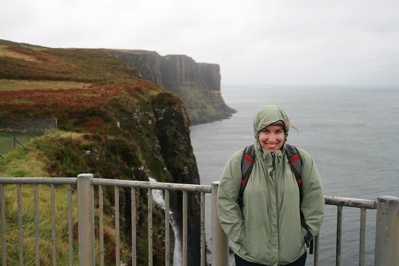 Matt and I first visited Skye back in 2008 on our honeymoon. Back then, we visited with big plans to hike in the Cuillin Mountains. But the weather during our trip was so bad, we didn’t even see the peaks through the clouds! We spent much of the week sheltering from the wind – here’s a honeymoon shot as an example!