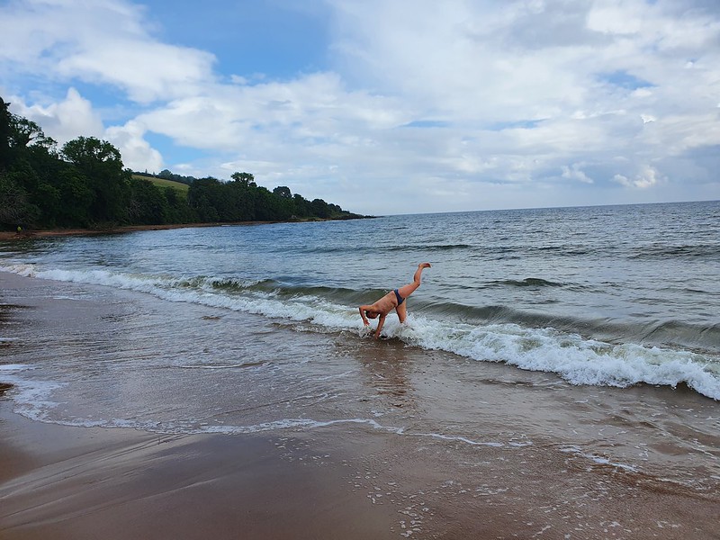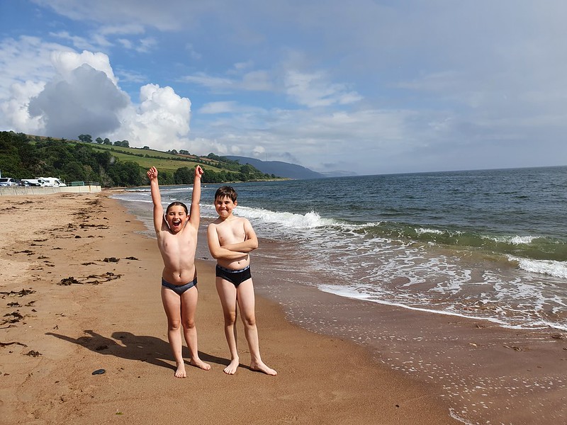 As we headed back into the village, the sun came out and the kids stripped off their clothes! We were both very impressed with our children splashing around in the North Sea – clearly they’ve got my Scottish blood!
